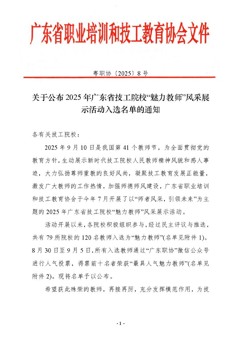关于公布2025 年广东省技工院校“魅力教师”风采展示活动入选名单的通知
