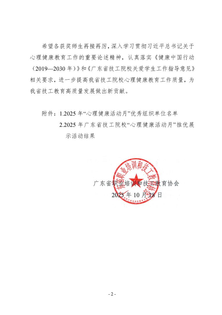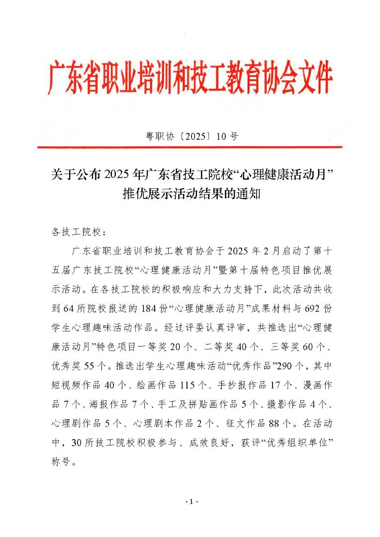 关于公布2025 年广东省技工院校“心理健康活动月” 推优展示活动结果的通知